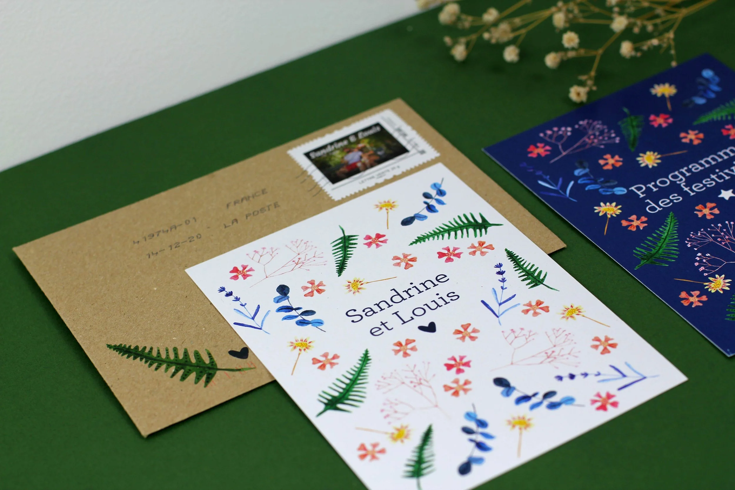 Le faire-part sera ensuite imprimé ou tamponné, selon les envies et les quantités souhaitées, puis envoyé. Je peux aussi fournir les enveloppes et décliner les faire-part à la demande.